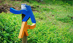 나무화살표 갈림길에서 종종 만나는 나무화살표는 나무 기둥에 설치한 파란색과 주황색 화살표가 진행 방향을 알려줍니다. 파란색 화살표는 정방향일 때 진행 방향을, 주황색 화살표는 역방향일 때 진행 방향을 가리킵니다. 보색 대비를 띄고 있어서 방향을 헷갈릴 염려는 없습니다.