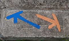 플레이트 화살표는 길바닥, 돌담, 전봇대 등에 붙어 길의 진행 방향을 알려줍니다. 파란색 화살표는 정방향으로 걸을 때의 진행 방향을, 주황색 화살표는 역방향으로 걸을 때의 진행 방향을 가리킵니다. 노란색 화살표는 휠체어 구간의 우회로를 의미합니다.