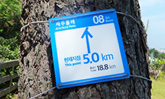 리본 제주의 푸른 바다를 상징하는 파란색 리본과 제주 대표 특산품 감귤을 상징하는 주황색의 리본 두 가닥을 한데 묶어 주로 전봇대와 나뭇가지에 매달아 놓았습니다. 사람의 눈높이보다 조금 높은 곳에서 한들한들 바람에 흔들리고 있지요. 멀리서도 눈에 잘 띄므로 리본만 잘 따라 걸어도 길을 잃을 염려가 없습니다.