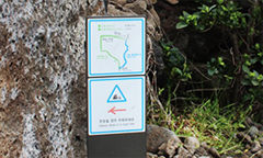 시작점 표시석 제주올레 각 코스의 시작과 끝을 알리는 표지석은 제주를 대표하는 돌 현무암으로 만들었습니다. 각 코스의 전체 경로와 경유지, 화장실 위치 등이 상세히 그려져 있습니다. 휴대폰 어플이 불필요할 정도로 자세히 기술되어 있어 굉장히 편리합니다.